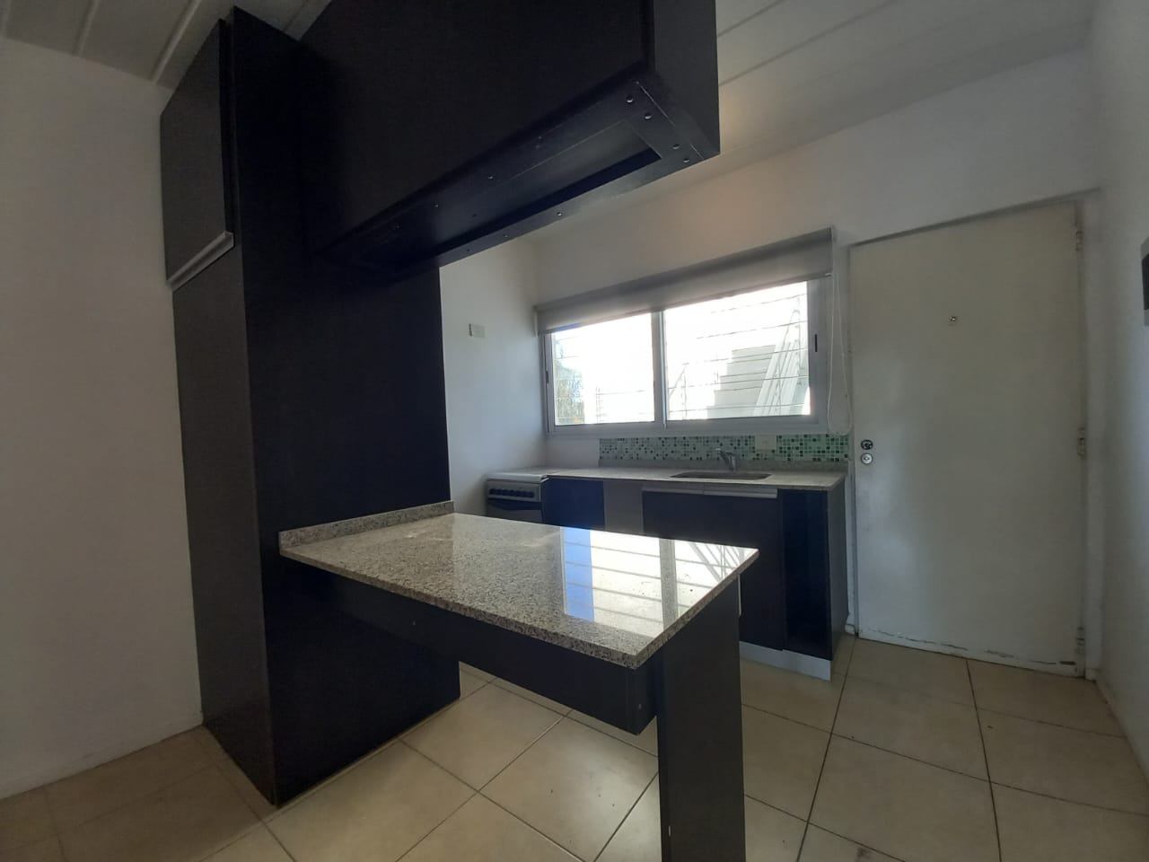 Sector cocina amoblado con artefacto de cocina, conexión para lavarropas y mueble tipo desayunador con lugar de guardado.